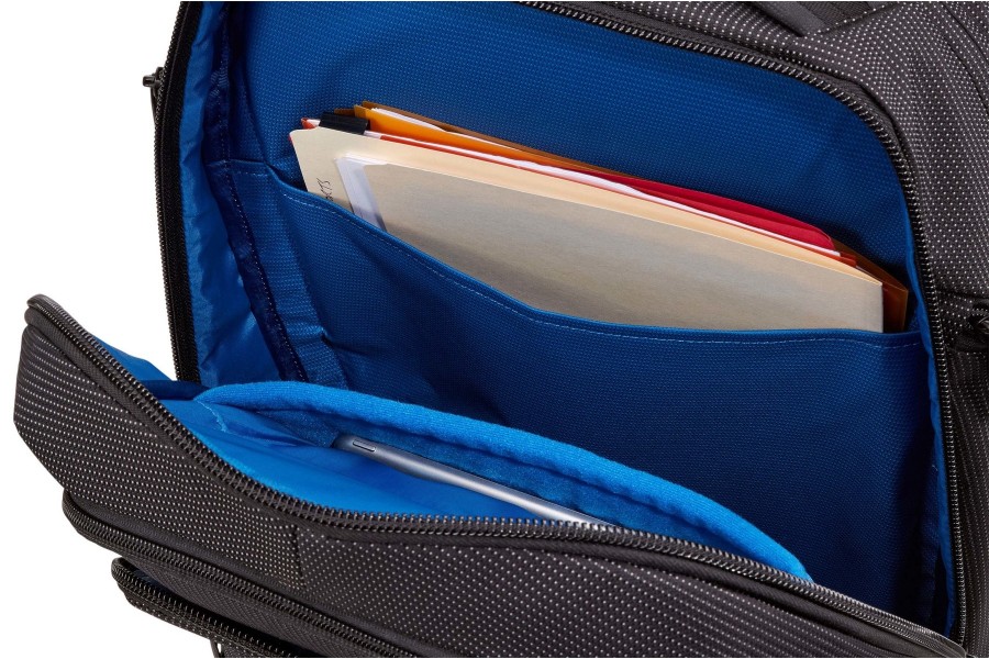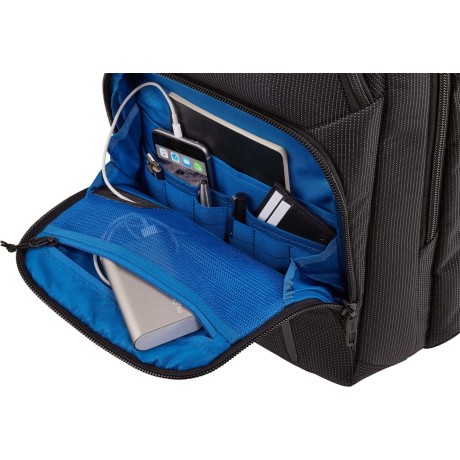 -Organiza artículos electrónicos pequeños y accesorios en el panel delantero con bolsillos. bucles elásticos. un bolsillo de malla con cremallera y el sistema de organización de cables PowerPocket. que permite cargar tus dispositivos mientras estás en movimiento.