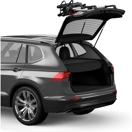 El portabicicletas sobre cajuela con plataforma elevada para una fácil salida que mantiene visibles las luces traseras y la placa de licencia.